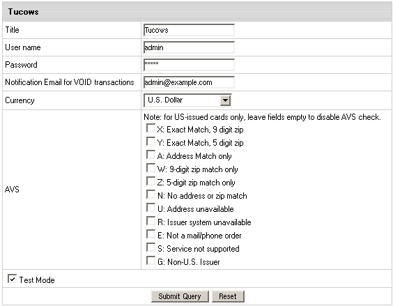 - Test Mode box: with Test Mode checked, all transactions appear to be processed as real transactions.