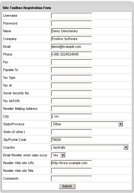 - Reseller Mailing Address, address to receive Site Toolbox notifications;