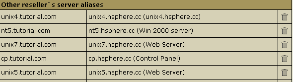 On the lower portion of your screen you will see all of the server aliases that service your reseller account. The Vortech H-Sphere server cluster includes over 70 servers that will host your websites, control panel, mail, databases and other reseller applications.