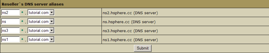 In order for your reseller account to function, you must create four (4) custom nameservers associated with your Service Domain. Typically a Service Domain is the domain name associated with your business or hosting Company such as www.VortechHosting.com. The four nameservers you create in H-Sphere will be based off of this domain and used by all end-user clients you host. Example: ns.vortechhosting.com and ns1.nortechhosting.com.
