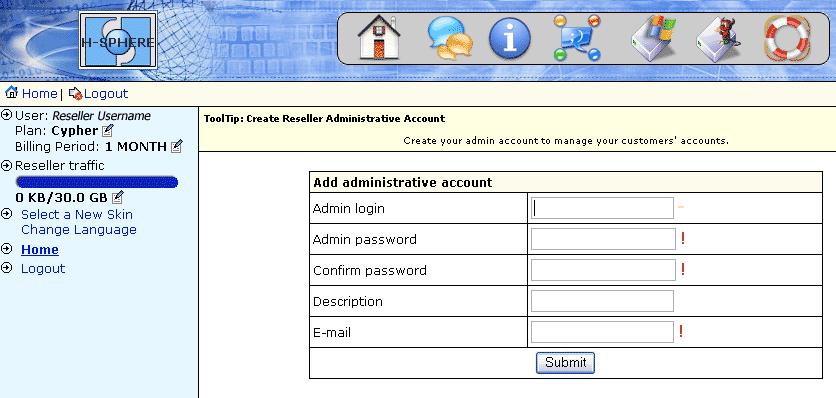 The H-Sphere Administrative Panel is the control center for your entire Reseller Account. This is the area where you build your hosting business from the ground up. Anything pertaining to your hosting plans, users, your customer billing, customer support, cash flow and branding features are available to you in this area. Some of the key features of the Administrative Panel are: