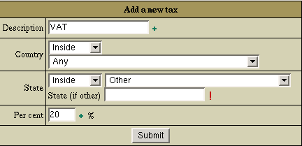 - Per cent: enter the tax amount. For instance, to apply a 12% VAT to your prices, enter 12.