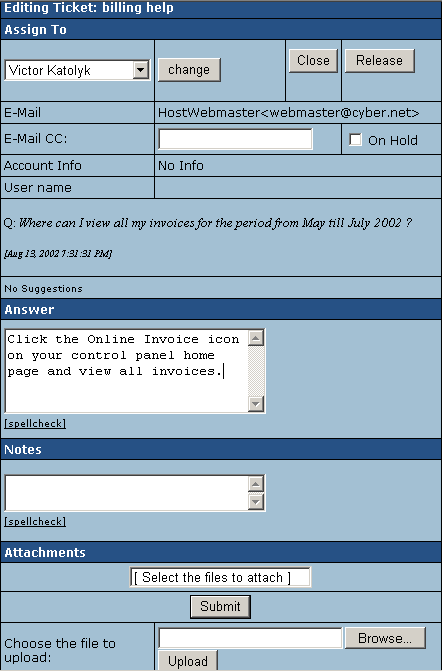 - On Hold: check this box if you want to delay answering this ticket.