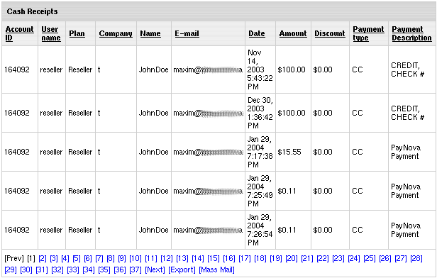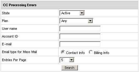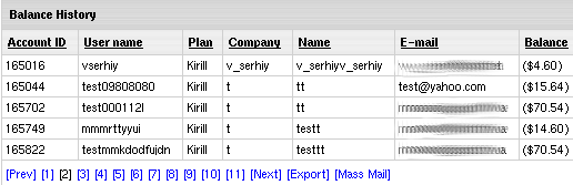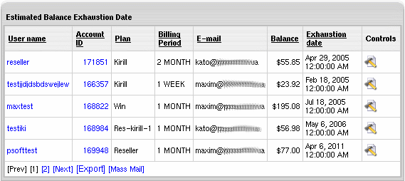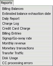 - Billing Balances searches user accounts by balance, days in debt, etc.