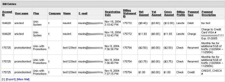 - Bill Entries lists billing entries along with payment type, billing profile, billing statement ID for all accounts.