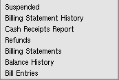 - Billing Statement History lists billing statements grouped by total of billing entries and age in days.