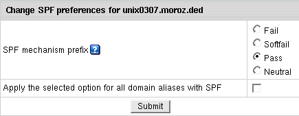 You configure SPF preferences when you enable SPF. Later you can change SPF configuration by clicking the Edit icon next in the mail domain/mail domain alias SPF entry: